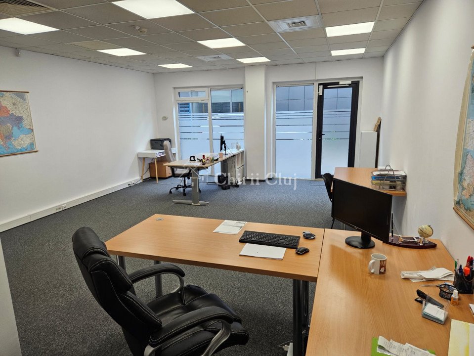 Situat in cladire de birouri de langa Vivo Center Cluj Napoca Spatiul disponibil este situat la parter, open space, 66mp utili + cota de spatii comune Curtea exterioara acomodeaza locuri de parcare inclusiv si pentru masini electrice, contra cost. Statie de transport in comun la 2 min pe jos Servicii de business center: receptie, paza, control acces, HVAC 4 tevi, iluminat LED, etc La pretul afisat se adauga taxa de servicii de 3eur/mp + TVA